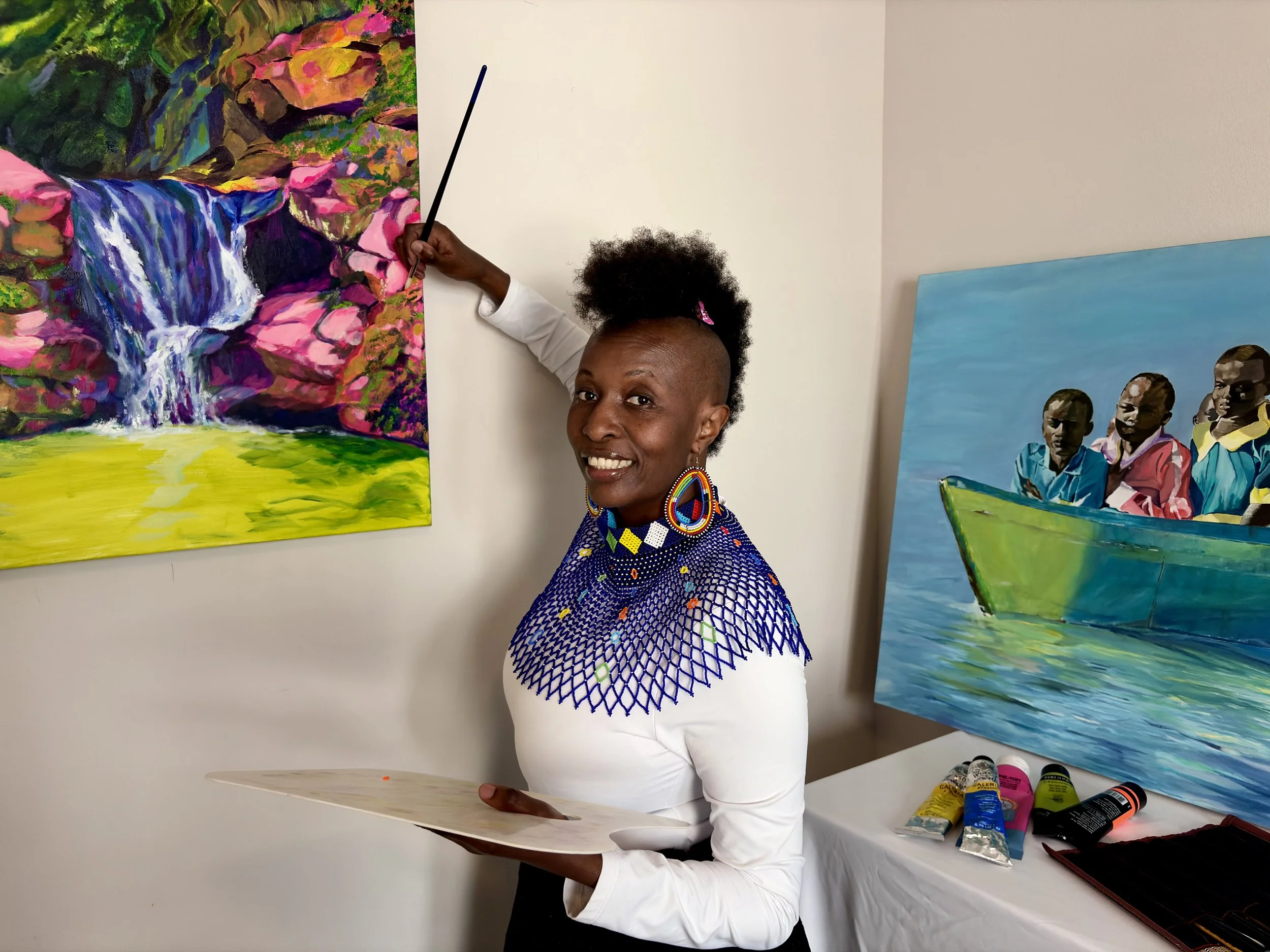 Grace Nguchu is a contemporary artist based in Austin, Texas. Growing up in Nairobi, Kenya, she was deeply inspired by her surroundings - the People and diverse expansive landscape, that evoked a sense of belonging and adventure. It was during this time that Nguchu took an interest in drawing, finding endless inspiration in nature and comic books. In 1998, she moved to the United States, initially settling in Hawaii before eventually finding her way to Austin, Texas. In 2018, she began to pursue her art career - drawing, painting, and establishing her unique voice as an artist. Nguchu regards her practice as a form of visual storytelling using vibrant colors to explore the beauty, fragility and resilience inherent in both humanity and the natural world. It is through her work, she seeks to cultivate a sense of care, preservation and environmental awareness, inviting viewers to see themselves reflected in the landscapes and lives she portrays.